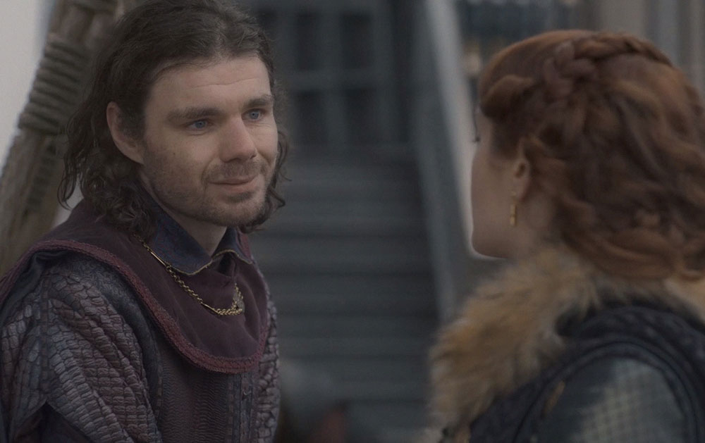 Нам показывают драку между Корри и Лейнором, которая якобы заканчивается смертью последнего – когда появляются Корлис и Рейнис, то обнаруживают в камине тело, обгоревшее до неузнаваемости. В это самое время где-то на берегу Лейнор отчаливает в лодке вместе со своим «убийцей». Причем, если пересмотреть драку внимательнее, то легко можно увидеть, что она с самого начала была явно разыграна: известный своим воинским искусством Корри рубил стул.