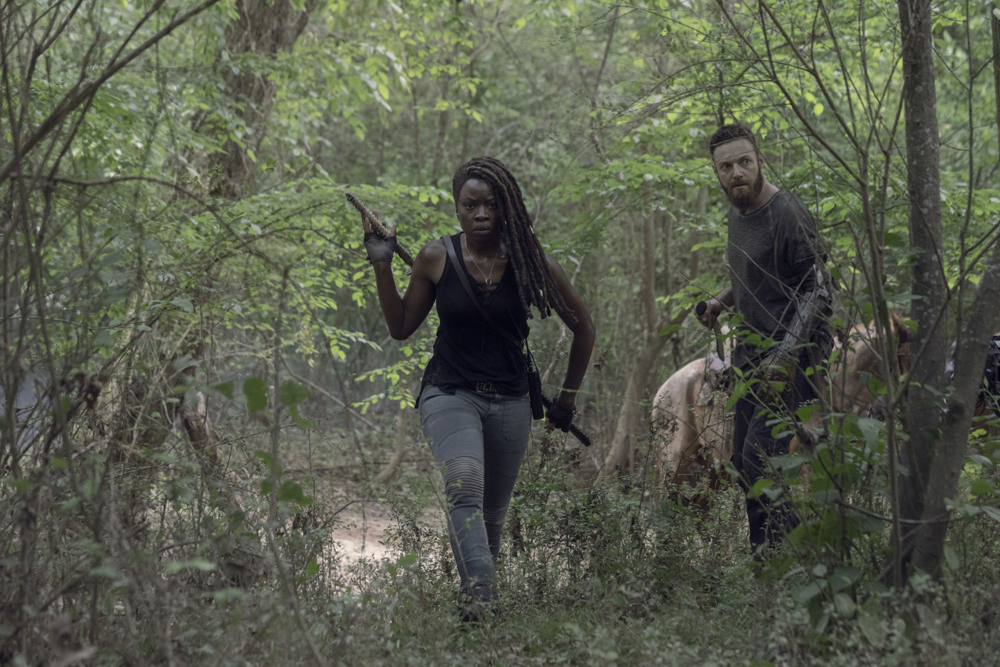 На снимках запечатлена подготовка Мишонн (Данай Гурира), Дэрила (Норман Ридус), Кэрол (Мелисса Макбрайд), Розиты (Кристиан Серратос), Аарона (Росс Маркуанд) и других выживших к битве с Шепчущимися во главе с Альфой (Саманта Мортон):