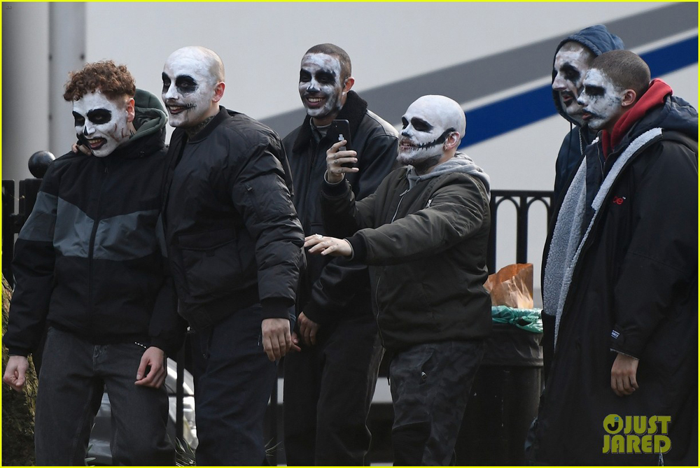 Можно было бы подумать, что это нечто вроде клоунского грима - намек на Джокера. Однако появление злодея не анонсировали, а хулиганы как-то совсем на клоунов не похожи. Скорее всего, это люди Пингвина (Колин Фаррелл) или просто какая-то мелкая бандитская группировка, с которой предстоит разобраться Брюсу Уэйну/ Бэтмену (Роберт Паттинсон).