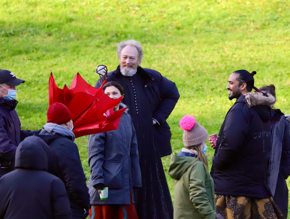 Кроме того, на снимках запечатлен бородатый Кагыр Маур Дыффин аэп Кеаллах (Имон Фэррен). Под современной курткой актера, кажется, нет одежды, а на его ногах брюки и сапоги в стиле брони армии Нильфгаард из первого сезона. Ранее Кагыр вместе с чародейкой Фрингильей Виго (Мими Дивени) был замечен в этой же локации побритым и с новой броней, а это значит, что перед нами, скорее всего, сцена, в которой злодей еще был пленником магов после битвы при Соддене.