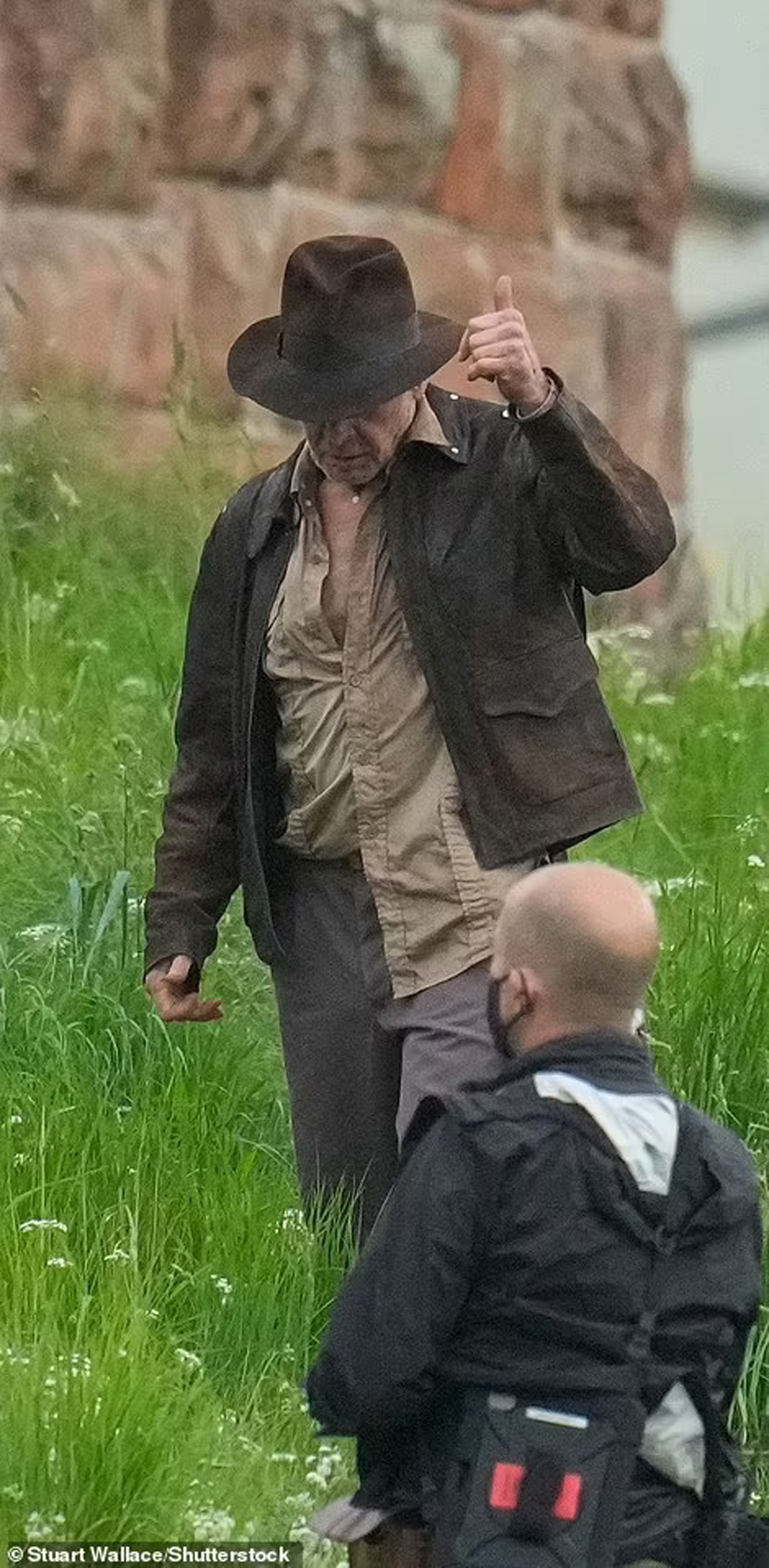 Ранее же на площадке был замечен дублер Форда с маской в виде его лица. Эти снимки подтвердили, что в фильме будут флэшбеки, в которых Индиана столкнется с нацистами.