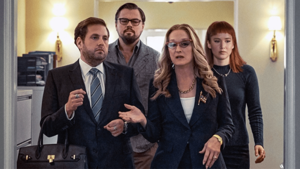 На кадрах можно также увидеть Мерил Стрип в роли президента США. Героине поможет разобраться в проблеме со страшными предсказаниями астрономов целая команда, важным участником которой будет ее сын в исполнении Джоны Хилла. И на снимках засветилась героиня певицы Арианы Гранде, которая отдыхает со своим бойфрендом – его сыграл Скотт Мескади, он же рэпер Кид Кади.