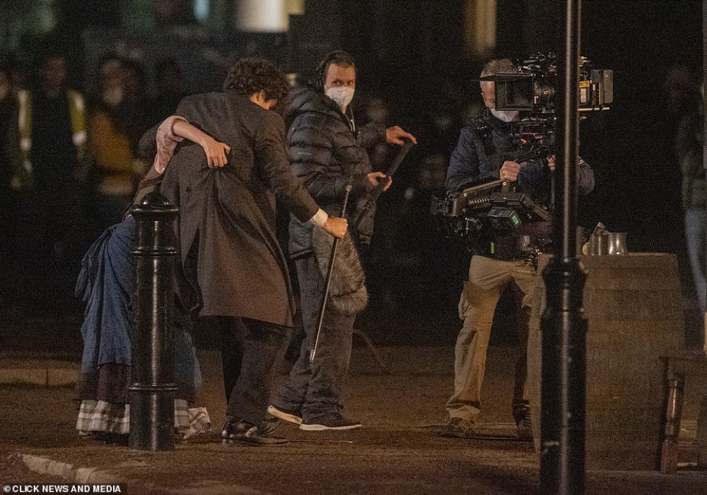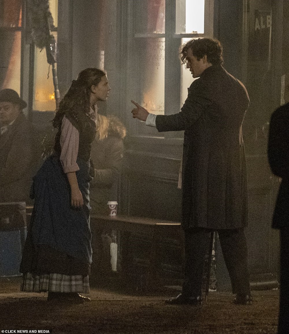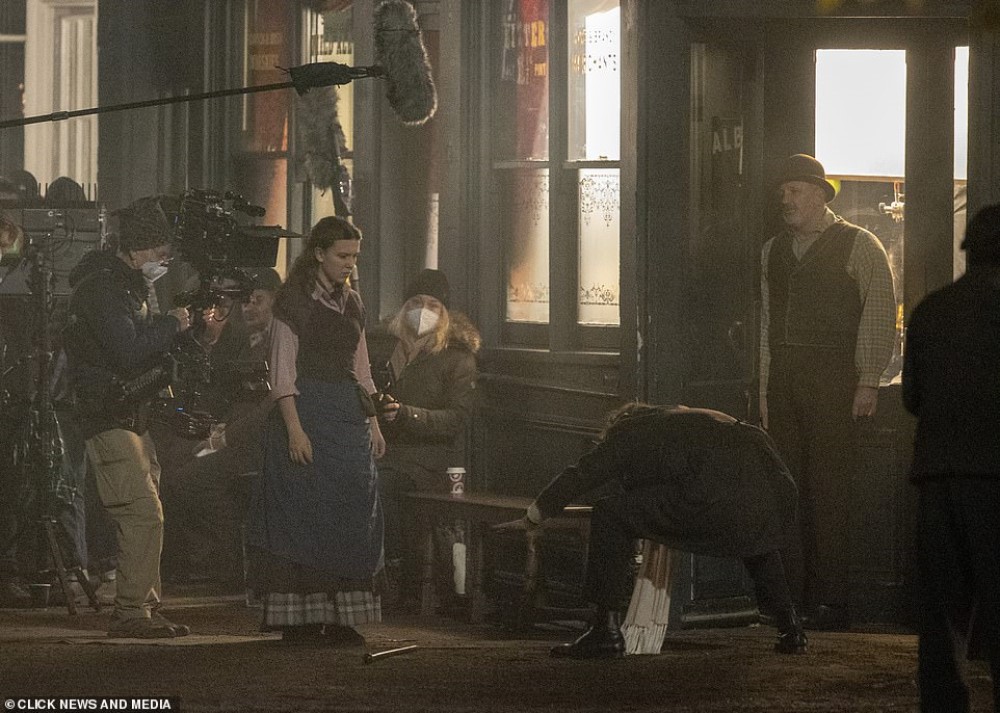 На фотографиях разворачивается полноценная сцена с возможным конфликтом персонажей. Так, можно увидеть, как пьяного Шерлока Холмса (Кавилл) выгоняют из паба Royal Oak в Лондоне. Герой падает и затем с трудом поднимается. Его сестра Энола Холмс (Браун) явно недовольна выходками братца – можно увидеть, как герои выясняют отношения.