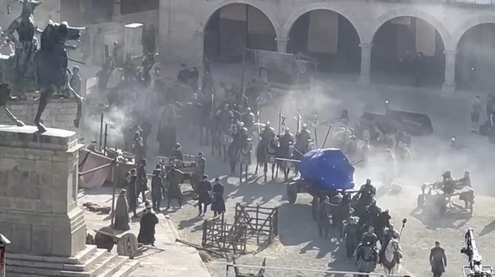 Фото выложили на просторах Reddit. На нем можно увидеть, как по площади Королевской Гавани везут на телеге синюю конструкцию. Таинственный объект чем-то утыкан – возможно, копьями. Скорее всего, при монтаже синюю конструкцию заменят на цифровую отрубленную голову дракона.