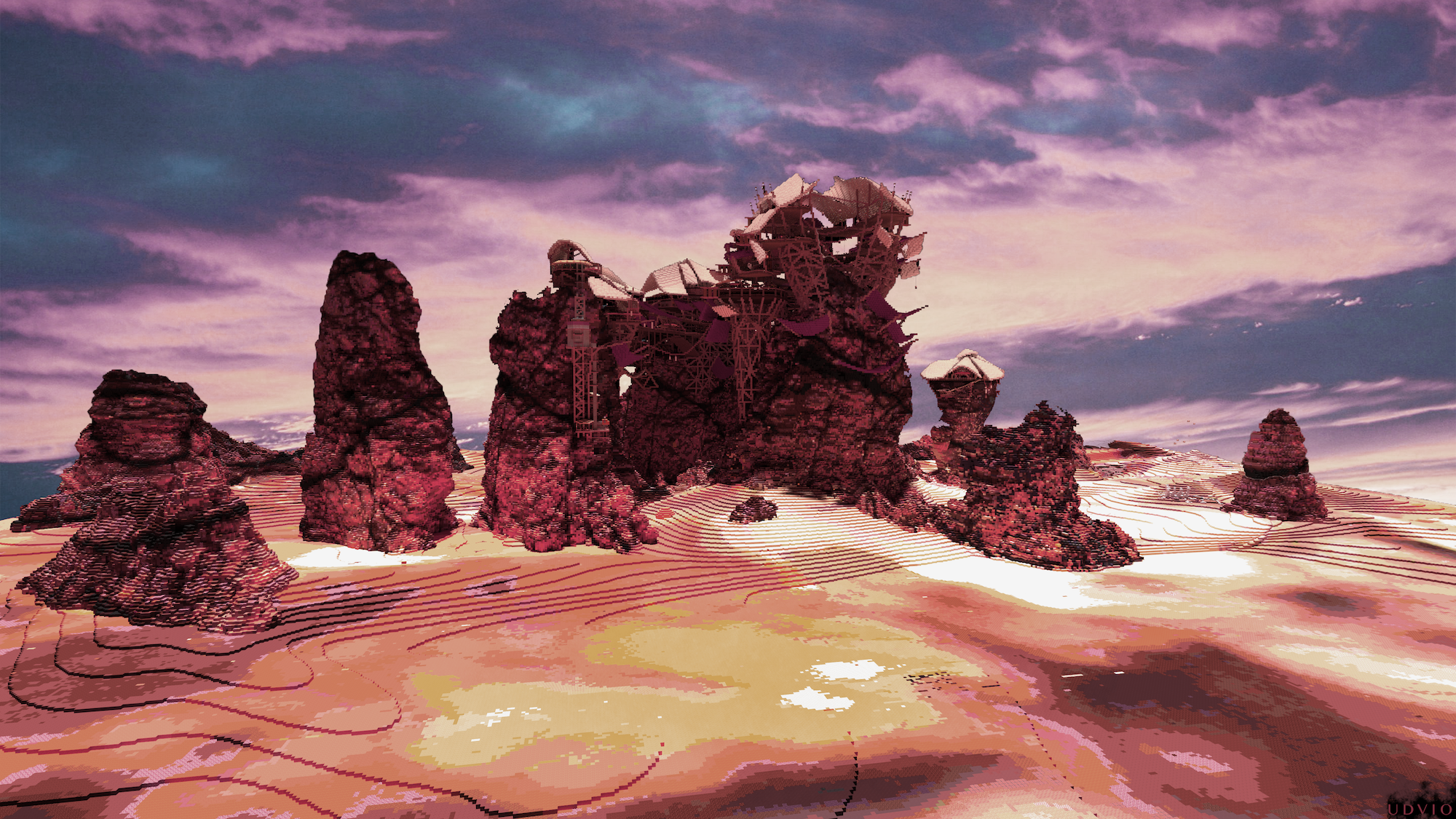 Игрок под ником Udvio построил в Minecraft сцены, вдохновленные другими играми. Например, он соорудил город из Guild Wars 2. Помимо копирования чужих произведений, художник работает над собственными мизансценами. Судя по масштабам, на их построение у автора ушел не один месяц, а возможно, и не один год.