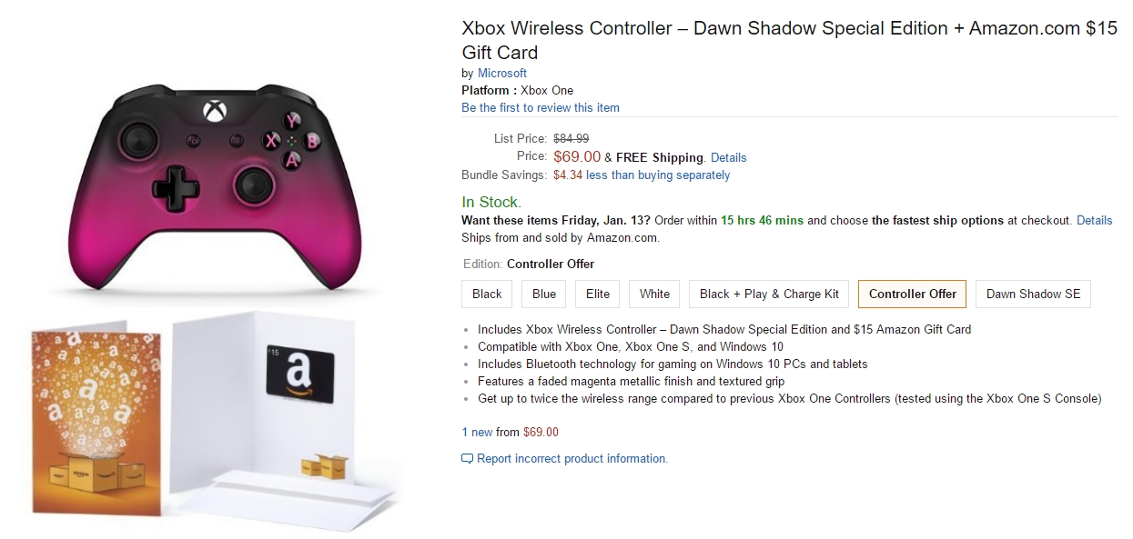На сайте Amazon появилось предложение, которое включает доплату за покупку беспроводного геймпада Dawn Shadow для Xbox One. Магазин сначала снизил цену с 84 долларов до 69, а затем предложил в качестве подарка сертификат на сумму 15 долларов. Таким образом, получается, что магазин платит за покупку контроллера.